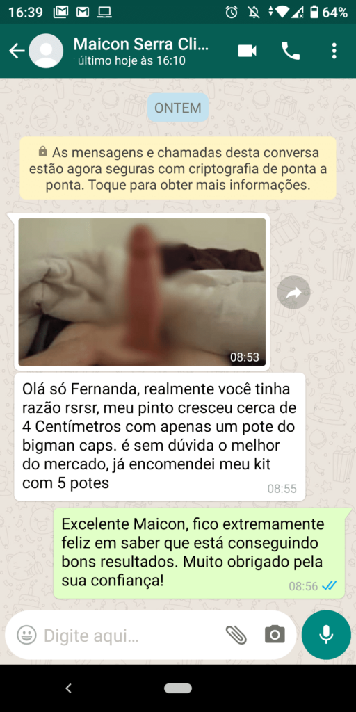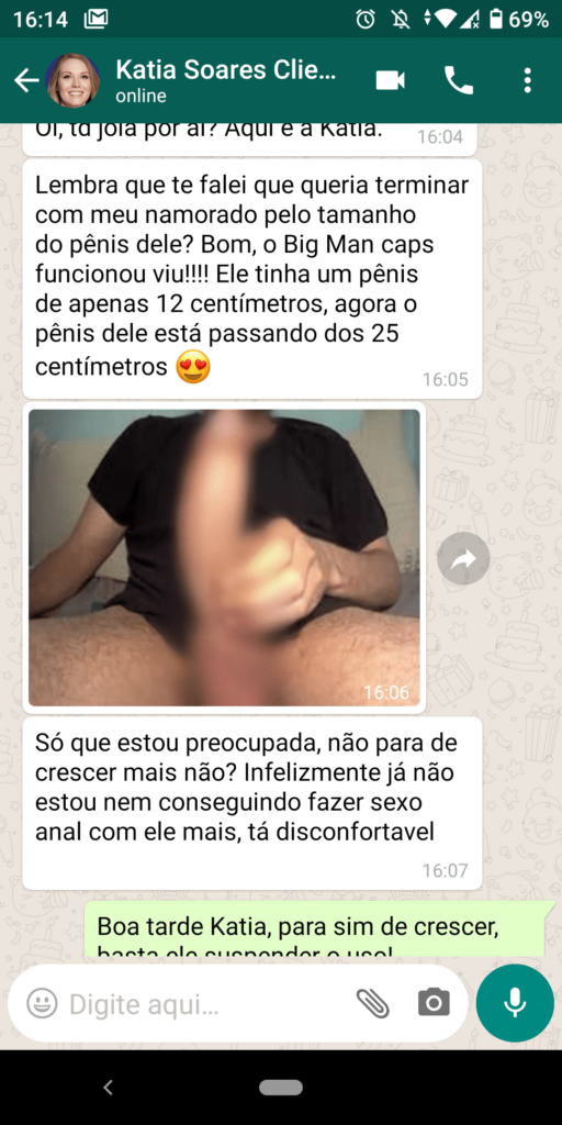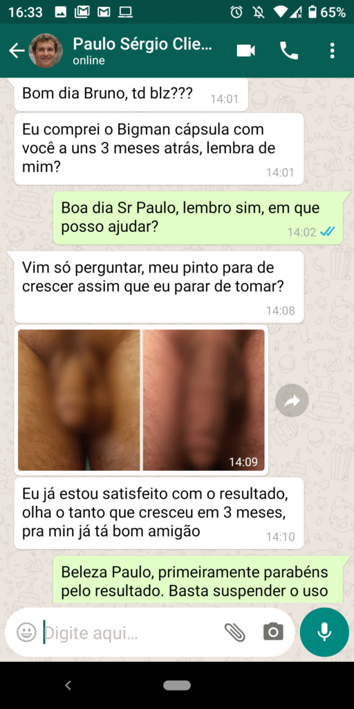 Sempre fui meio complexado com o tamanho do meu pau, por isso a vida inteira tive dificuldades de chegar nas mulheres ou de começar um relacionamento, pois morria de medo e vergonha que quando chegasse a hora do vamo ver a menina ficasse decepcionada comigo. Um amigo me falou do BIG MAN CAPS e resolvi experimentar e já tem mais de 6 meses que uso e foi a melhor decisão da minha vida. Em pouco tempo já consegui 5cm a mais e só esse aumentinho já mudou a minha vida, sem contar que agora eu tenho ereção a hora que eu quero.